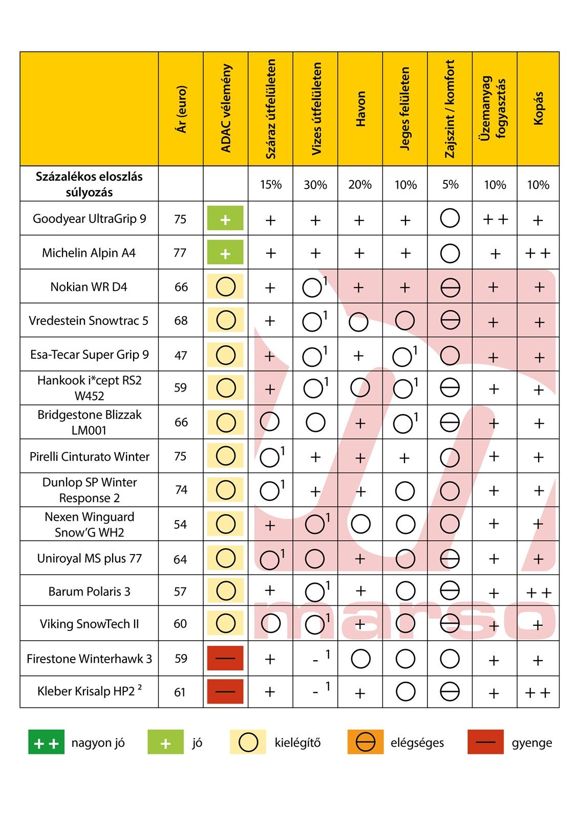 Az ADAC teszt „jó” minősítését a Goodyear UltraGrip 9 és a Michelin Alpin A4 kapta. Mindkét modell különösen kiegyensúlyozott eredményeket hozott, amelyhez kevés gyengeség társult. A Goodyear kapta általánosságban a legjobb pontszámot és minden egyéb tulajdonsága mellett még az üzemanyag fogyasztása is nagyon gazdaságos. A rangsorban a következő a Michelin, amely kiemelkedik különösen magas kopásállósága miatt. Az ADAC tesztjén középkategóriába sorolható abroncsok a „kielégítő” jelzőt kapták, ezen belül is három csoportot lehet megkülönböztetni. A Nokian WR D4 a Pirelli Cinturatoval együtt alkotják az első csoportot, enyhe gyengeséggel. A középkategória második csoportjába hat gumiabroncs került, melyek a gyengeségeiket tekintve nem kaphattak jobb megítélést, habár összességében még mindig kiegyensúlyozott teljesítményt nyújtottak.