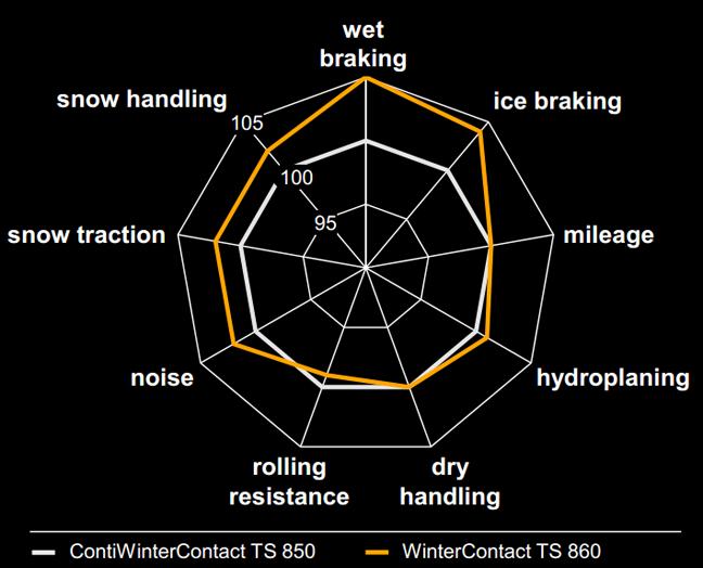 Mintázata jobban kezeli a havat, ebben a közegben jobb tapadást nyújt, mint versenytársai. Csökkentett gördülési ellenállás az elődhöz képest.