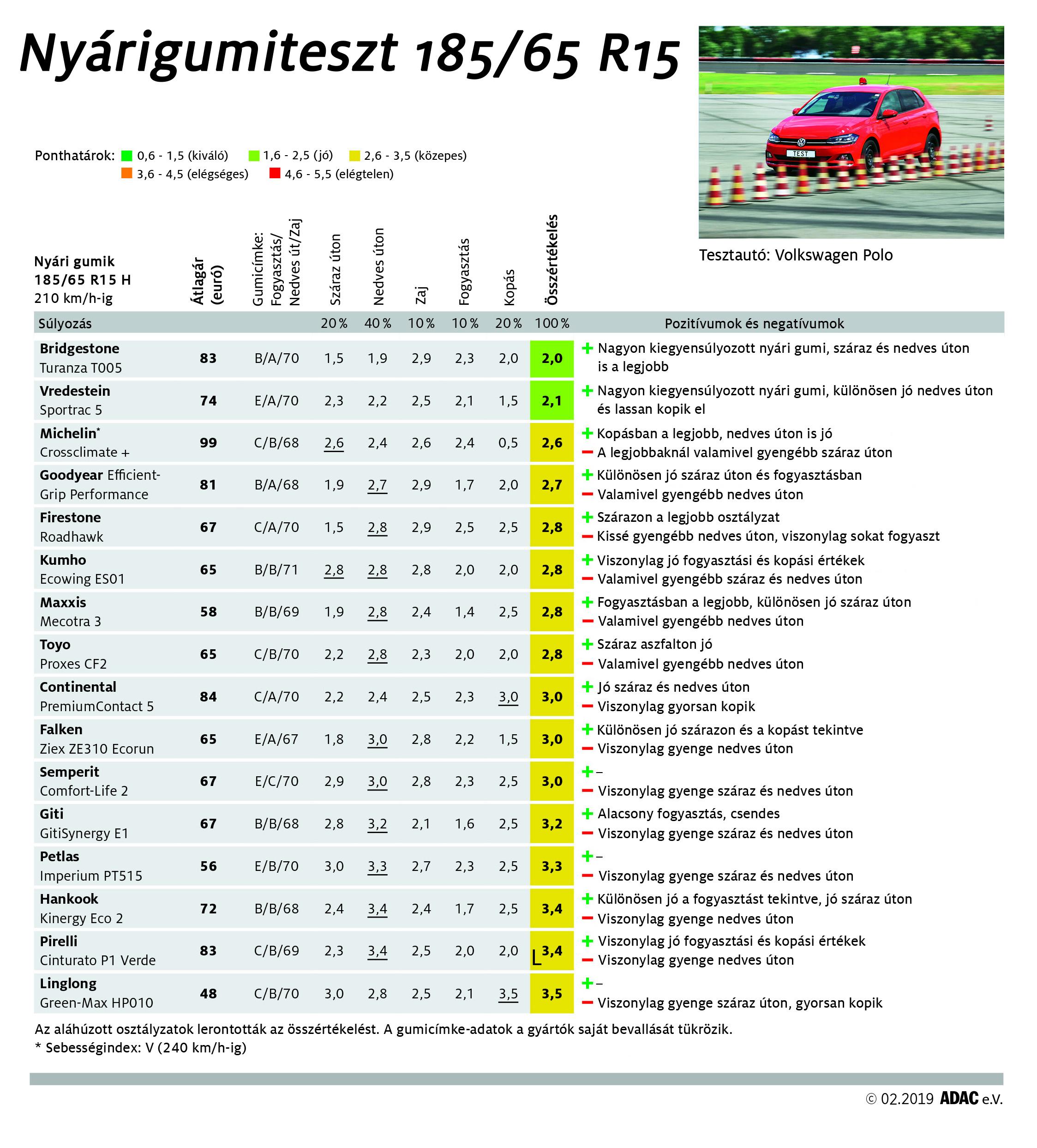 Összességében a szárazon és nedvesen is jó Bridgestone Turanza T005 söpörte be a győzelmet. Mindössze egy tizeddel maradt le a Vredestein Sportrac 5, amely tapadásban gyengébb volt a Bridgestone-nál, viszont jóval tartósabb is. Mögöttük aztán mindegyik gumi közepest kapott, igaz, a bronzérmes Michelin és a sereghajtó Linglong között majdnem egy egész pont a különbség.